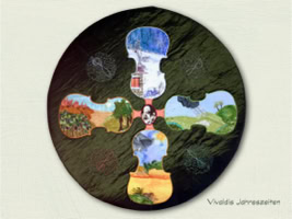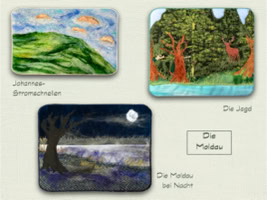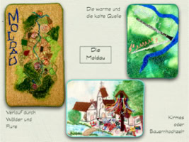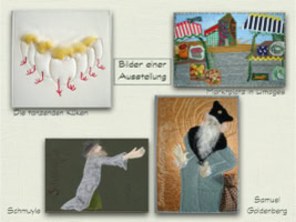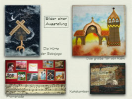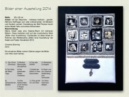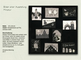 Die Idee, die Bilder einer Ausstellung textil umzusetzen entstand, als wir im Orchester dieses Werk einstudierten und im November 2008 aufführten. Durch die intensiver Beschäftigung mit der Musik hatte ich das Bedürfnis, auch die „BILDER“ dazu wieder erstehen zu lassen - auf meine individuelle Art. Leider sind die meisten der ursprünglichen Bilder von Viktor Hartmann (Maler und Freund Mussorgskis) verschollen…Sammlung von den „Bildern einer Ausstellung“ besteht aus 12 kleinformatigen Einzel-Werken