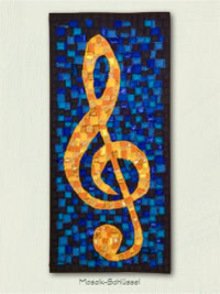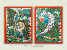 Beide Werke - der Violin- und der Bassschlüssel - sind in den gleichen Farben und Mustern gehalten und in graphische Muster „eingebettet“. Für die Schlüssel selbst habe ich Notenstoffe verwendet. Die schwungvollen Konturen der Schlüssel setzen sich im Bild fort, wodurch das Bewegende der Musik ausgedrückt wird.