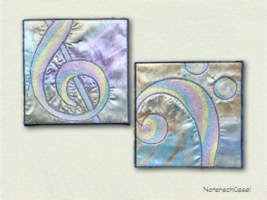 Nadelmalerei in Pastelltönen der Motive „Violinschlüssel“ und „Bass-Schlüssel“ auf seidigem, selbstgefärbten Grund.