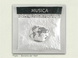 Die Erdteile sind gefilzt und dann mit Noten bestickt (Handstickerei). Die Notenlinien „umfassen“ die Kugel und sind Symbol für das Verbindende. Im Kontrast zu dem überwiegenden Weiß steht der obere schwarze Streifen, auf dem in freier Maschinenstickerei kreuz und quer verschiedene Sprachen zu lesen sind (in Grautönen). Darüber und wieder durch das Weiß dominierend steht das Wort „MUSICA“.