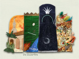 Für meine textile Darstellung von Mozarts „Zauberflöte“ habe ich mich auf die vier Hauptpersonen festgelegt und für jede eine einzelne Arbeit angefertigt. Zusammen gehängt stehen sie für die Geschichte der Zauberflöte.