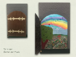 Diese Tür führt aus einem dunklen Raum (Mauerwerk) in einen bunten Garten der Musik. Sie ist auf der Rückseite mit den Namen vieler Komponisten beschrieben.