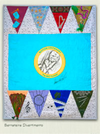 Meine textile Arbeit zu dieser Komposition zeigt als Hauptmotiv die Flagge Bostons, aller- dings nicht mit der Stadtsilhouette sondern mit einem Bild des Dirigenten Leonard. Bernstein (Kohlezeichnung auf Seide). Im gelben Mittelkreis stehen statt der ursprünglichen Worte„Boston Centenary“ in Anlehnung an das Hauptmotiv des Orchesterwerks und die Bezeichnung des letzten Satzes „The BSO forever“.