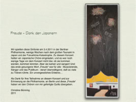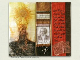 Im Mittelteil befindet sich ein Bild des Komponisten (gedruckt auf Seide) mit seiner Unterschrift, welche ich freihat mit der Maschine gestickt habe. Darüber ist ein Druck der Original-Handschrift Beethovens, und zwar der die Noten zu „Freude schöner Götterfunken“. Im rechten Teil ist ein Zitat von Beethoven über seine Einstellung zur Musik und der Kraft, die sie ausübt. Darunter ist wieder ein Ausdruck seiner Handschrift zu dieser Sinfonie (auf Seide). Dieses „Blatt“ ist zerknüllt und wieder geglättet, beinahe wie seine Notenblätter. Dies symbolisiert seine Zweifel, die er mit dieser für ihn so bedeutenden Sinfonie hatte, das ständige Verbessern, Ändern, Streichen und Neukomponieren… sie war für ihn nie vollendet. Der linke Teil zeigt den Ausbruch aus dem Dunkel, den Depressionen, den Zweifeln hin zum Licht, die wachsende Freude, die schließlich strahlend wie die Sonne über alles scheint - der Sieg der Hoffnung!