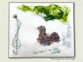 Hauptmotiv in meiner Arbeit ist der Eiffelturm, gestickt aus Notenlinien in den Farben rot, weiß und blau - die Farben Frankreichs und Amerikas. In die einzelnen Turmabschnitte sind Noten gestickt, die typischen Melodien aus Gershwins Werk. Auf den Querverstrebungen des Turms Gershwins Name. Dem Eiffelturm zu Füßen liegt die bunte Stadt Paris (von mir durch ein besonderes, buntes, wirres „Gewebe“ dargestellt) , durchzogen von der Seine, an deren Ufern sich verschiedene Instrumente - vor allem auch eine Taxihupe - und Pariser Postkartenansichten aus den 20er Jahren aufreihen. Diese Sehenswürdigkeiten von Paris wird der junge Amerikaner in genau dieser Zeit wohl gesehen haben auf seinem Spaziergang. Und da ist er auch schon - unser Amerikaner. Ich nenne ihn George. Er ist als bewegliche Figur auf den textilen Untergrund aufgebracht, so daß er wirklich „spazieren“, freundlich „grüßen“ und sein Amerika-Fähnchen „schwenken“ kann.