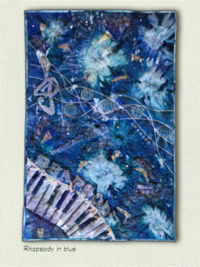 Diese Rhapsodie ist eines der bekanntesten Werke von George Gershwin. Es wurde 1924 in New York uraufgeführt, noch mit dem Titel „An Experiment in Modern Music“. Es handelt sich um ein Auftragswerk, und es sollte „typisch amerikanisch“ sein. Es war ein Versuch klassische Sinfonik und Jazz einander gegenüber zustellen, sie miteinander zu verbinden… In meiner Arbeit stelle ich die beiden Begriffe „Jazz“ und „klassische Sinfonik“ einander gegenüber, getrennt durch eine Band von verschlungenen Notenlinien, diese drücken das Verbinden der verschiedenen Stile aus. Auch die Wörter „Rhythmus“ und „America“ habe ich verwendet. Links unten ist ein Stück Klaviertastatur als Symbol für das Soloinstrument. Die angedeuteten Blüten und Glitzersteine stehen für die wunderbaren Melodien, die weltberühmt sind, und den Glanz dieses Stückes. Selbstverständlich ist diese Arbeit blau.