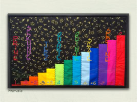 Hier widmete ich mich dem Thema „Intervalle“. Jedem Intervall innerhalb der Oktave ist eine Farbe zugeordnet, bei großen und kleinen Intervallen wurden helle und dunkle Farbtöne verwendet. Die Farben bauen sich auf wie das Regenbogenspektrum. Da es zu jedem Intervall auch ein Komplementär-Intervall gibt (beide zusammen ergeben immer einen Oktav-Abstand), habe ich für die Stickerei der Bezeichnungen (Name und zugehörige Kurzbezeichnung/Zahl am unteren Rand) immer die Farbe des Komplementärs gewählt.